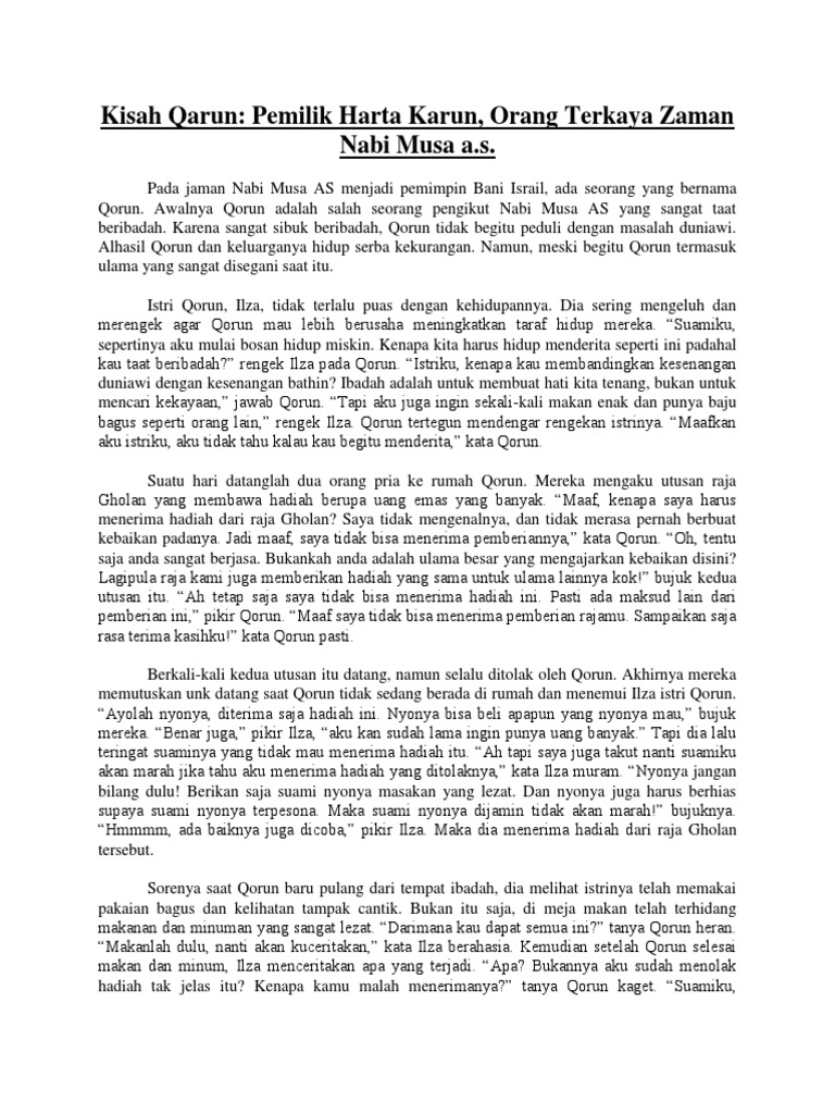 Bosan dengan keadaannya, qarun meminta nabi musa untuk mendoakannya agar allah memberikannya harta benda yang sangat banyak. Kisah nabi musa alaihissalam ini sebenarnya merupakan cerita fakta atau memang benar benar terjadi pada masa itu, dan lebih tepatnya disebut sejarah karena memang banyak fakta dan bukti fisik bahwa kisah ini memang benar benar terjadi, banyak sekali keteladanan nabi musa. Suatu waktu qarun memohon kepada nabi musa a.s. Mukjizat kisah nabi musa a s. Tak berselang lama, qarun mendatangi nabi musa dan mengatakan: Nabi musa 'alaihis salam adalah nabi paling mulia di kalangan bani israil. Kaummu sedang berkumpul sambil menunggu perintah dan larangan darimu. Nabi musa dewasa merantau meninggalkan mesir menuju madyan, dan di sana, dirinya bertemu dengan nabi syu'aib as lalu menikah dengan salah satu anaknya. Qarun adalah salah seorang dari umat nabi musa a.s. Baginda digelar 'kalimullah ~ orang yang diajak berbicara langsung oleh allah di dunia ini. Akan tetapi, qarun mendurhakai nabi musa dan harun. Akan tetapi, qarun mendurhakai nabi musa dan harun, ia tidak menerima nasihat keduanya, dan ia menyangka bahwa harta dan kenikmatan yang ketika qarun terus bersikap sombong dan congkak, maka allah benamkan qarun dan rumahnya ke dalam bumi, dan tidak ada seorang pun yang. Janganlah tertipu dengan harta dan kekayaanmu. tak mempn apa yang dikatakan oleh nabi musa terhadap qarun.